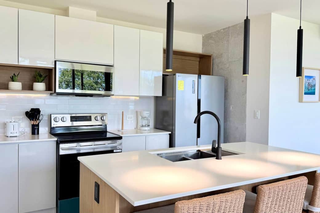 Blender, Coffee machine, Cooking utensils, Kitchen stove, Kitchenette, Microwave, Oven, Refrigerator, Toaster