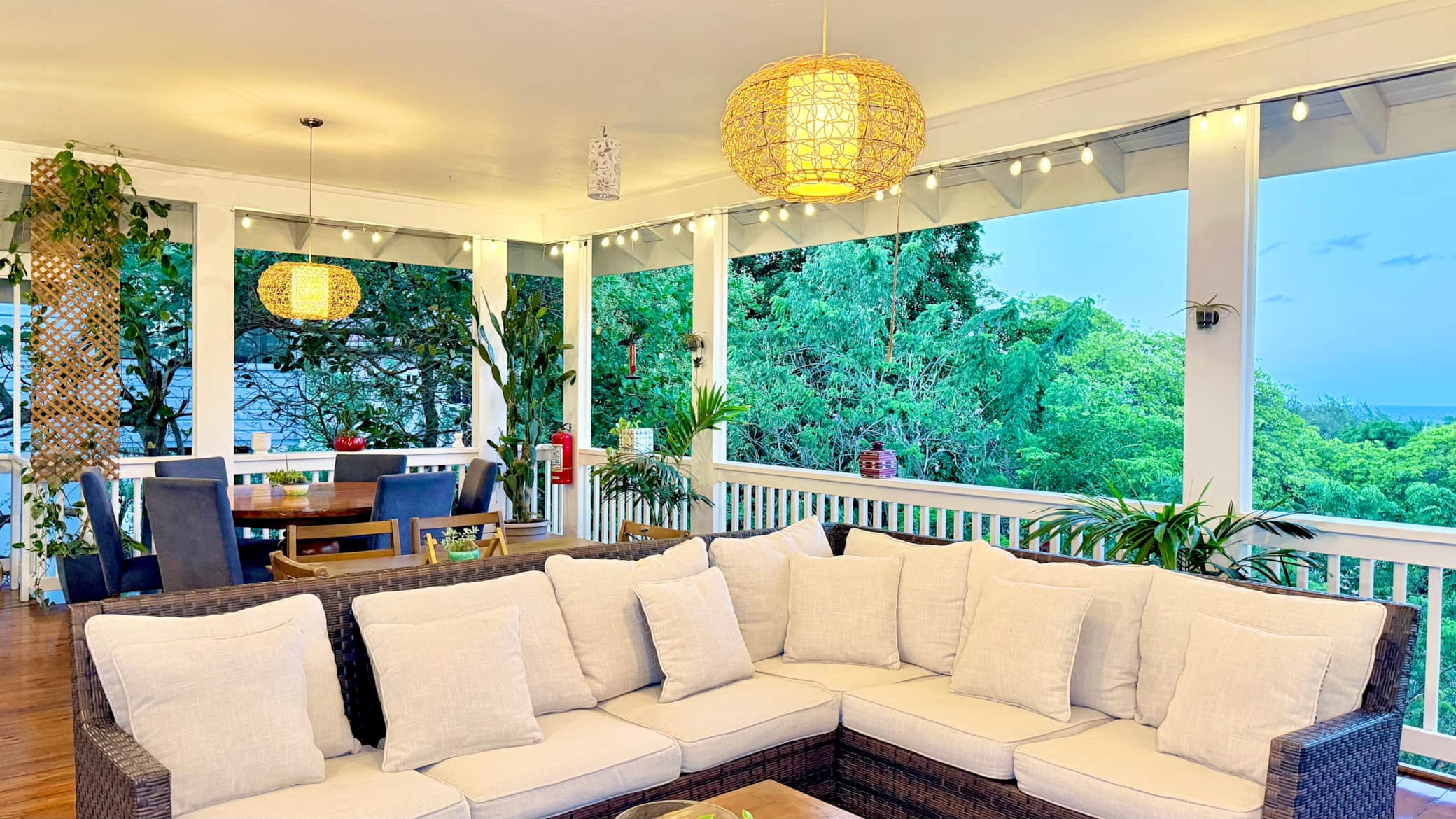 Out back, a spacious terrace awaits—complete with a grill, cozy sofas, and a dining table—perfect for savoring meals with friends while soaking in the breeze and catching a glimpse of the ocean.